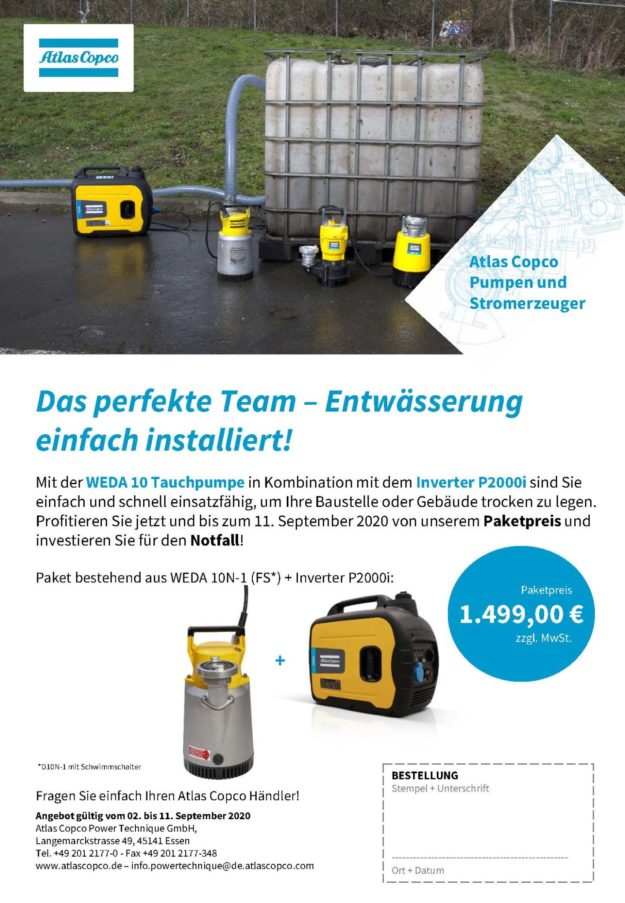 Das perfekte Team – Entwässerung einfach installiert! Mit der WEDA 10 Tauchpumpe in Kombination mit dem Inverter P2000i sind Sie einfach und schnell einsatzfähig, um Ihre Baustelle oder Gebäude trocken zu legen. Profitieren Sie jetzt und bis zum 11. September 2020 von unserem Paketpreis und investieren Sie für den Notfall! Paketpreis nur jetzt bis…